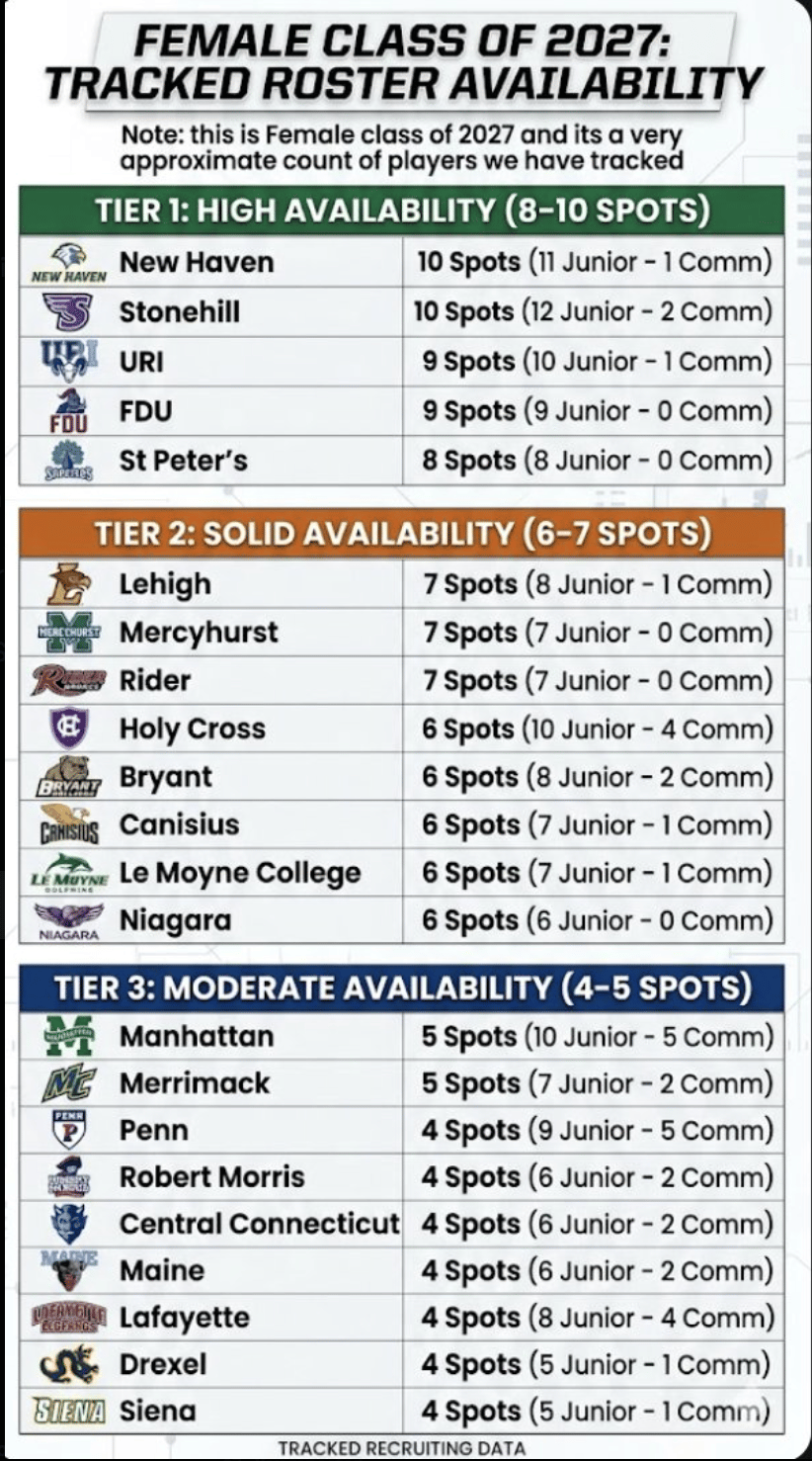 Tier 1 (The Open Doors): Programs like New Haven, Stonehill, and URI have high availability with 8-10 spots still open. These schools have a high count of Juniors (players leaving) and only 1 or 2 commits so far. That is a massive opportunity to get a foot in the door.